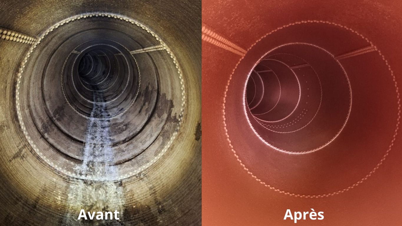 L’intervention a été menée par tronçons d’environ 200 mètres sur une conduite rivetée de 1 kilomètre, d’un diamètre de 202 cm, représentant une surface totale de 7.700 m². Compte tenu de la vétusté de l’ouvrage et de son mode d’assemblage, les équipes ont adapté la méthodologie d’application afin de répondre aux exigences du client et au plan qualité défini pour le projet. Jusqu’à 22 travailleurs ont été mobilisés sur le chantier, avec des moyens spécifiques comprenant notamment des installations de sablage, de ventilation et de mesure hygrométrique.
