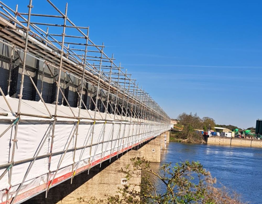 À l’Île Monsin, à Liège, les équipes de Travhydro ont réalisé un chantier technique d’envergure avec la mise en place d’un échafaudage suspendu sur un pont de 270 mètres de long, enjambant à la fois la Meuse.