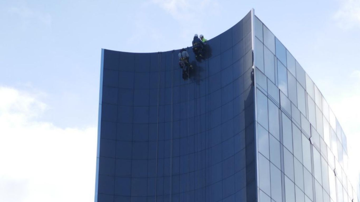 Parlement européen : ProAccess réalise une pose de vinyles en façade, sur cordes, à 35 mètres de hauteur