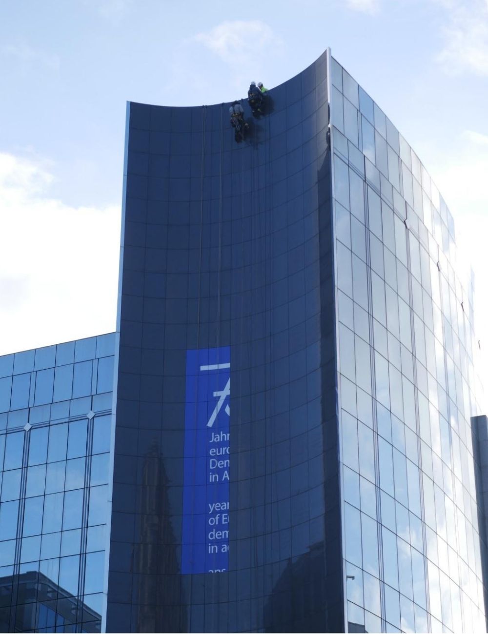 À l’occasion des 70 ans de l’action démocrate en Europe, les équipes de ProAccess sont intervenues sur le bâtiment G. Zweig du Parlement européen pour une pose de vinyles en façade, réalisée sur cordes avec rapidité, précision et maîtrise